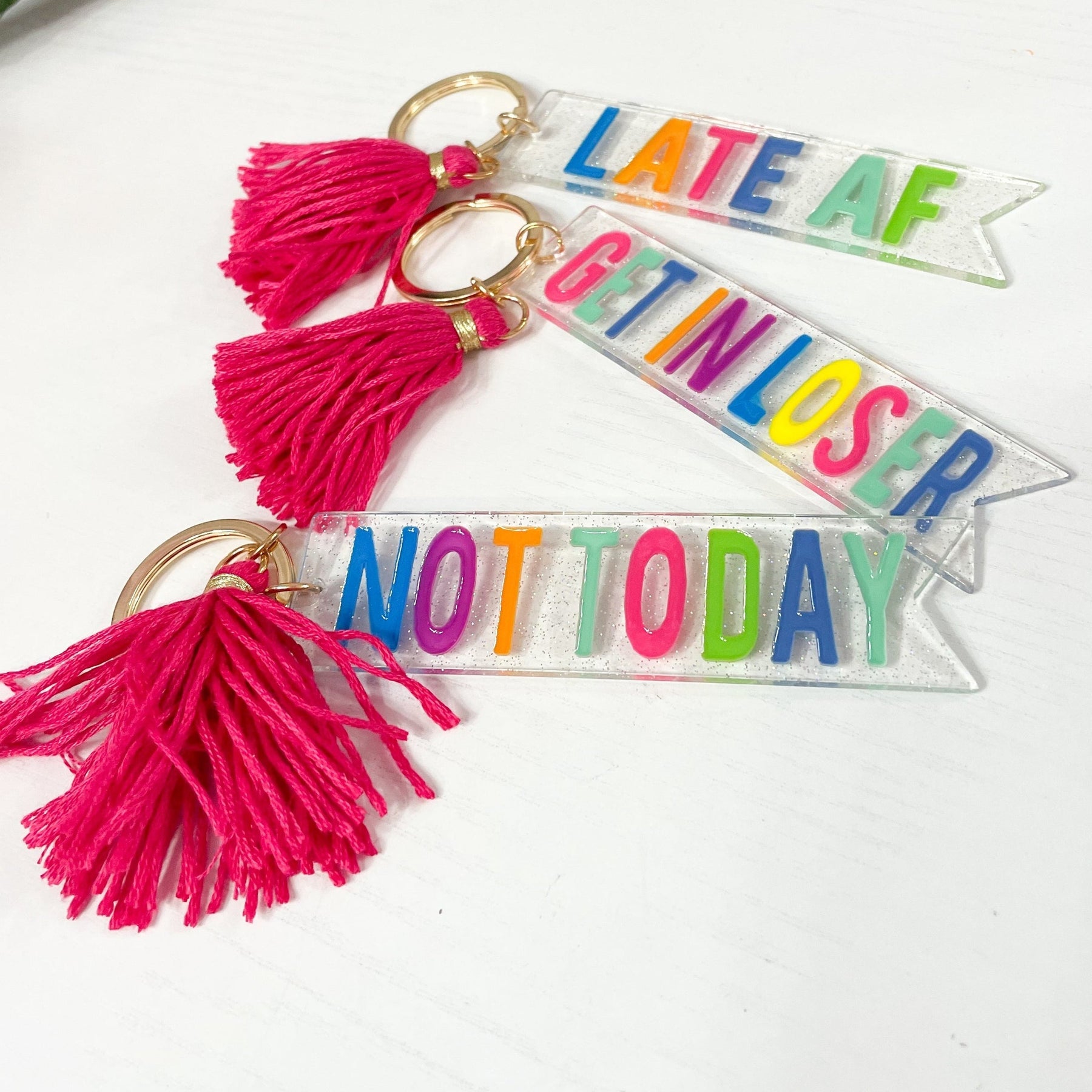 Make a statement with this cute and quirky pink tassel acrylic keychain! Perfect for your keys or bag, this fun and stylish keychain will be sure to get you noticed! Be the envy of your friends and add this eye-catching little accessory to your collection!